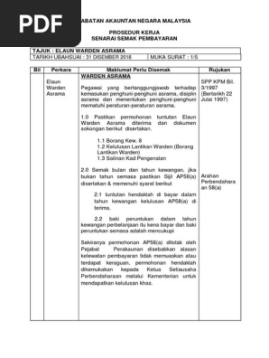 Jabatan akauntan negara malaysia prosedur kerja senarai semak. PUTRAJAYA Jumlah elaun warden asrama di sekolah berasrama di bawah Kementerian Pendidikan Malaysia KPM dinaikkan sebanyak 25 peratus. KUALA LUMPUR 24 Zulkaedah 1443H Jumaat Setelah hampir 25 tahun kadar elaun warden sekolah berasrama di bawah selian Kementerian Pendidikan tidak.
